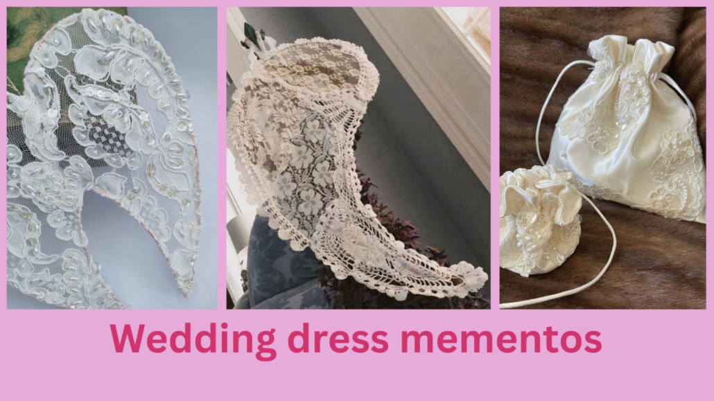 - Small mementos made from wedding-dress or special fabrics. One example is a small angel wing ornament or small keepsake bag that families could receive at memorial services or keep as a holiday remembrance (see photos).
